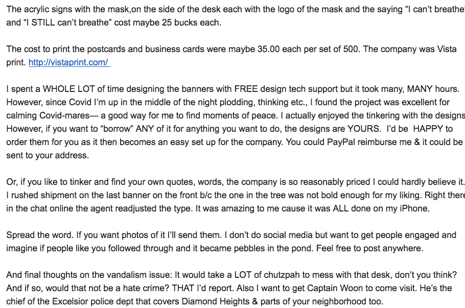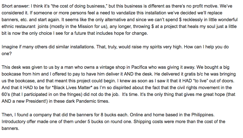 I saw this piece of interactive art on the streets of SF (you can visit it yourself: it’s on the even side of the 800 block of Duncan – between 814 and 892 Duncan St, San Francisco, CA 94131) & left a note asking the creator if they had thought about vandalism before creating the art. They hollered back with some pics and their musings – you can find those both below!