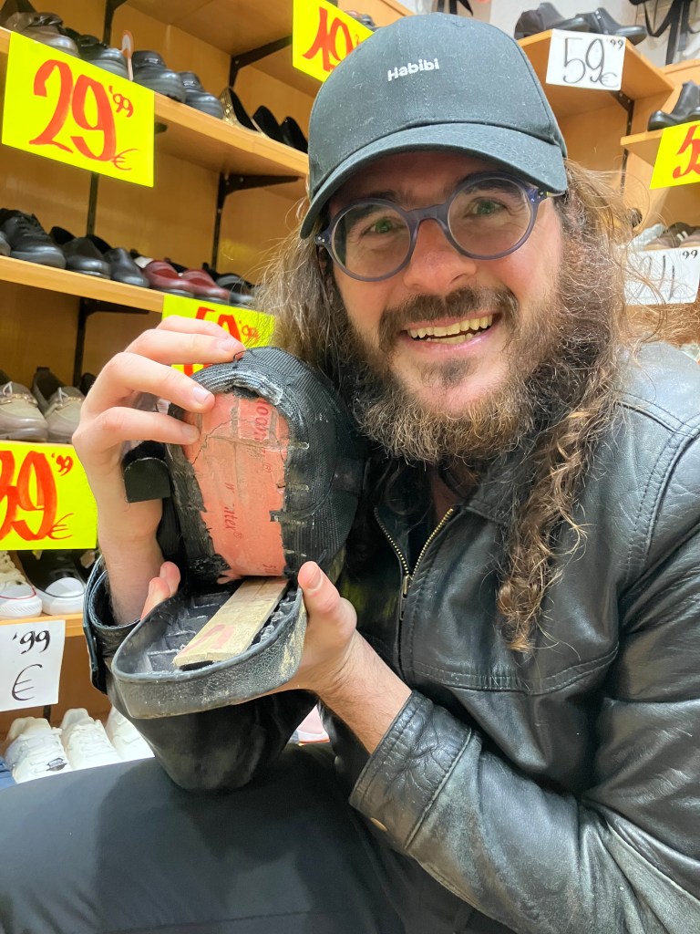 The clerk showed me a pair of decent-looking sneakers: twenty euros. I tried them on. He only had the left shoe in size 44 and the right shoe in 45. The clerk agrees to a discount, and apologizes he cannot give us a greater one. After all, what shoe store only sells mismatched shoes?